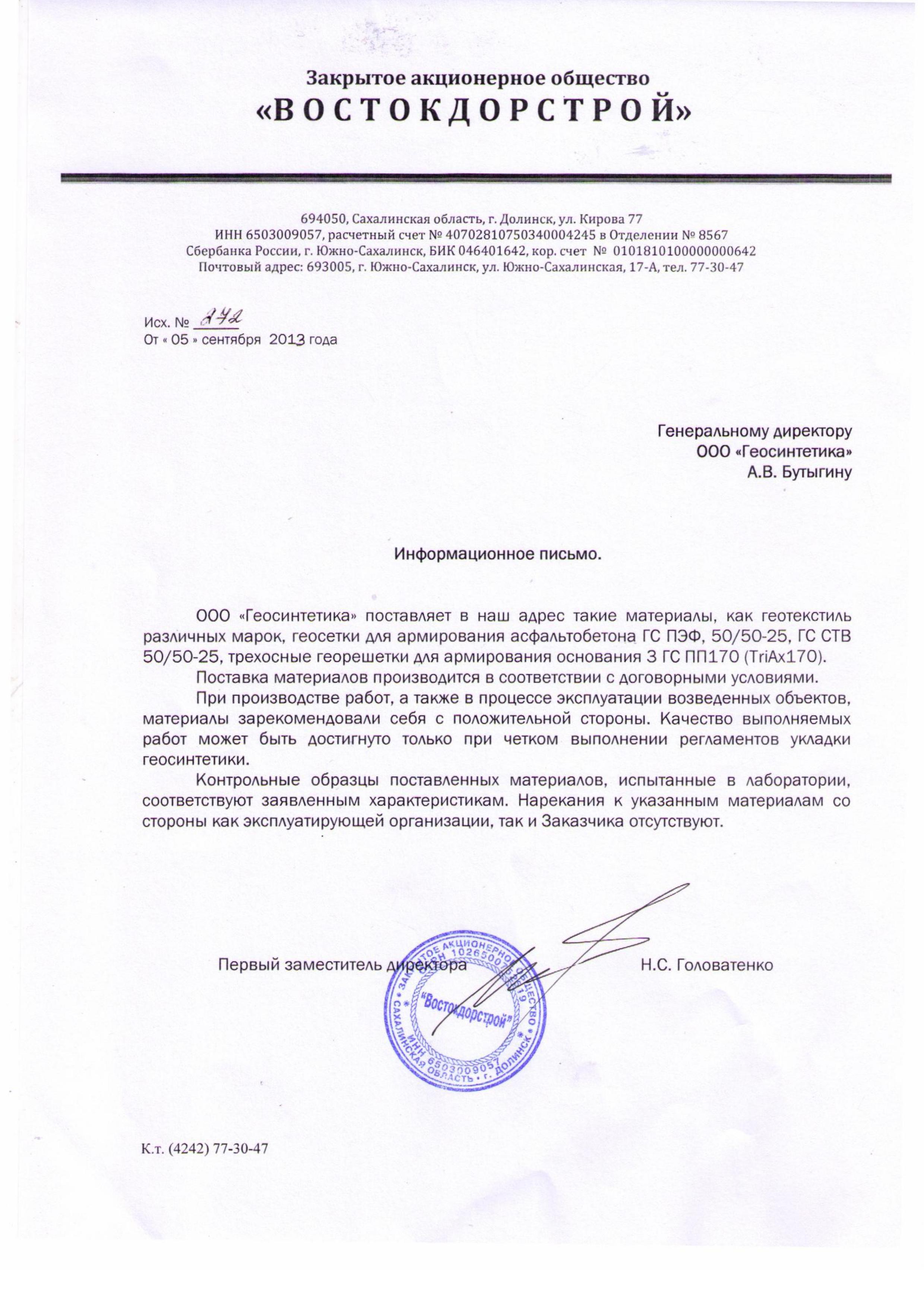 В соответствии с договорами поставки ООО "Русгеосинт" поставляет в наш адрес следующие материалы: геотекстиль (пл. 200, пл.350), геосетку ГС ПЭФ(к)